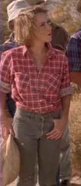 There is a blond-haired girl at the Montana dig site dressed